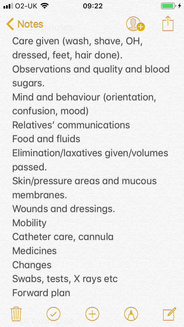 2. Do my notes include everything that needs to be included? I don’t know about you, but I can’t remember everything I’ve done. So after the incident described above, I made a note on my phone about the patient’s activities of daily living (ADLs) and used this as a reminder to write about each.